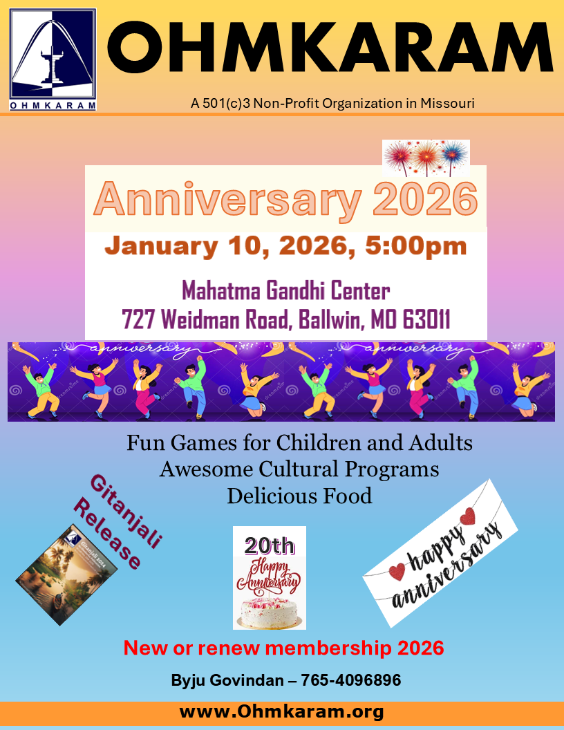 For more information contact President Anjana Prayaga 636-293-1174 or email us at info@ohmkaram.org